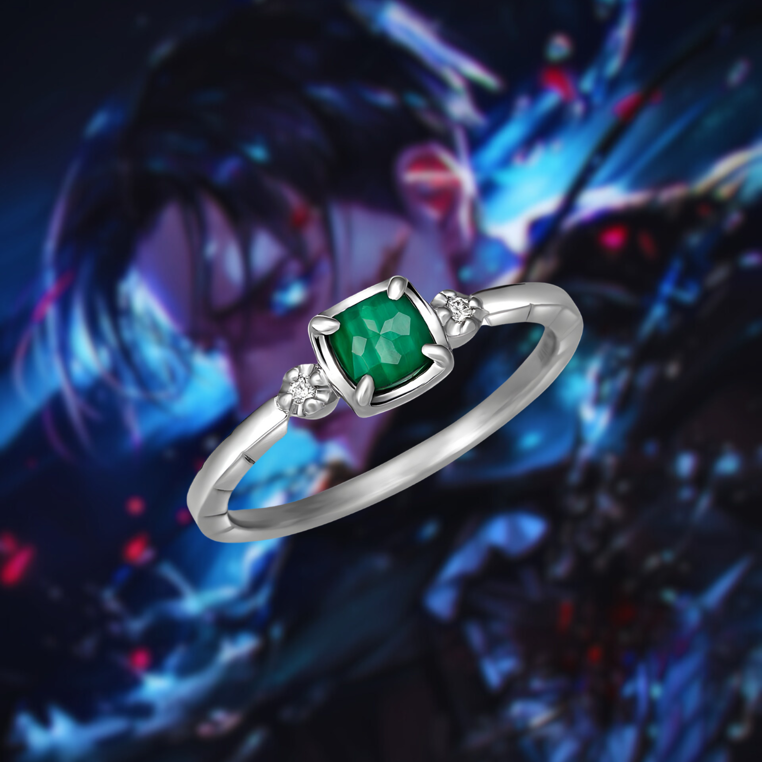 Honor the indomitable spirit of Captain Levi with this stunning Levi Ackerman Ring. Crafted with meticulous attention to detail, this ring features a captivating green natural stone at its center, symbolizing Levi's iconic green cloak. The stone is a carefully designed gemstone doublet, with malachite as the base and white quartz on top, representing Levi's role as a leader who always guides his comrades through challenges. The sides of the ring are inspired by Levi’s unique spinning attack, while the back showcases the Survey Corps insignia.